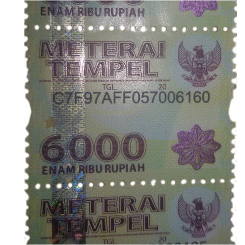 Kalau ini jadi insya Allah kita berhadapan dengan UU Bea Materai yang baru mungkin dalam waktu tidak terlalu lama,” kata Yon. METERAI TEMPEL 6000 DAN 3000 Gambar foto dan spesifikasi meterai tempel baru 6000 (enam ribu rupiah) dan 3000 (tiga ribu rupiah) disosialisaikan k. No Repost PENDAHULUAN Berawal dari ane tadi disuruh Atasan buat ke Kantor Pos untuk kirim surat dan beli METERAI (Tulisannya yang bener METERAI ya gan, bukan materai), dan pas ane lihat meterai 6000 yang sekarang memiliki design baru.