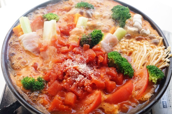 創味シャンタンで絶品鍋 豚肉のセロリ巻き入り イタリアントマト鍋 〆はパスタ 料理と趣味の部屋