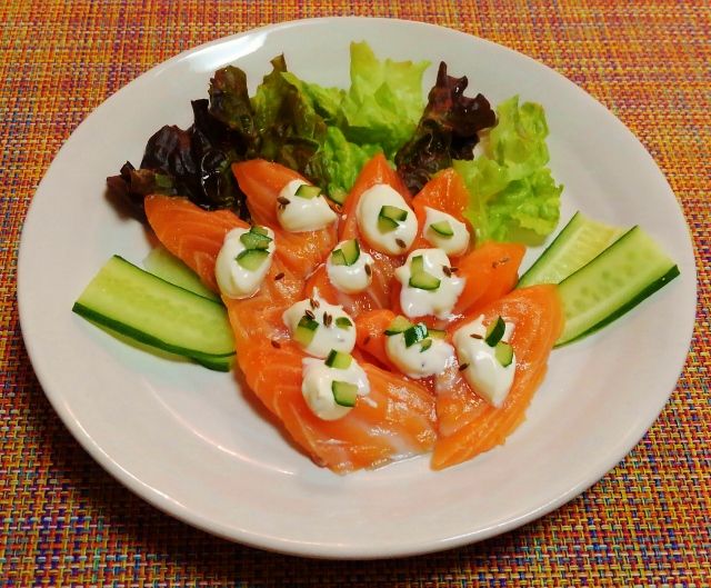 11日の晩御飯が続くよ 笑 サーモンカルパッチョ風ヨーグルトドレッシングディル風味 水は方円の器に随う